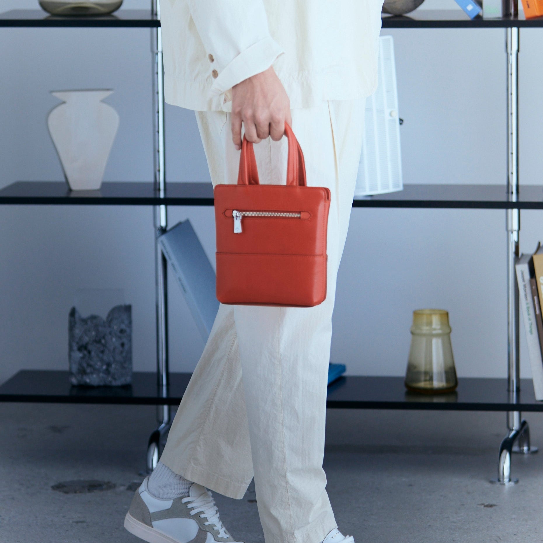 いつものスタイリングに少しだけ彩りを添えるなら、バッグの色遊びが効果的。特にレッドやオレンジは、派手すぎず、それでいて存在感を放つ絶妙な差し色です。