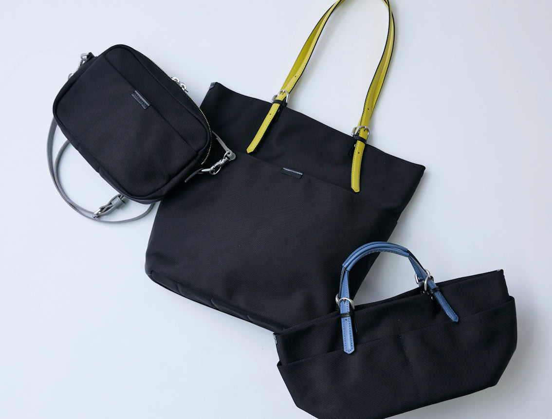 シンプルなバッグが多い中、ほんの少し遊び心をプラスできたら。そんな想いから生まれた「Colors」シリーズ。ブラックボディをベースに、カラフルなハンドル・ショルダーストラップが付属し、まるで着替えるように、気分やスタイルに合わせてカラーをチェンジ。